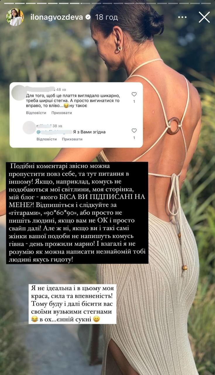 "Взагалі я не розумію, як можна написати незнайомій тобі людині якусь гидоту! Я неідеальна, і в цьому моя краса, сила та впевненість! Тому буду і далі бісити вас своїми вузькими стегнами в о*у*нній сукні. Я не очікую від своїх підписників лестощів, але й не дозволю більше переходити мої межі! Не витрачайте свою енергію й мій час!", - підсумувала Ілона.