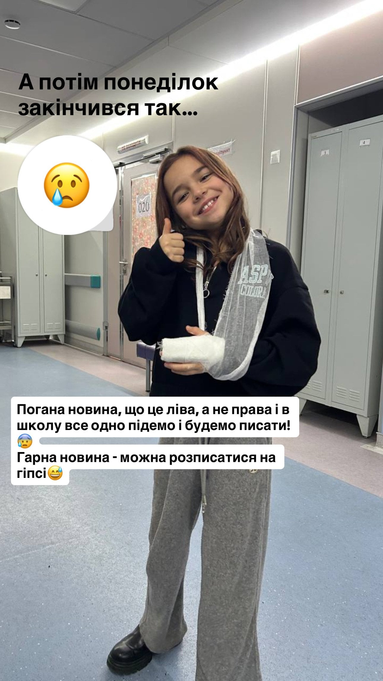 "Понеділок (8 грудня – прим. ред.) закінчився так…Погана новина, що це ліва, а не права, і до школи все одно підемо і будемо писати! Гарна новина – можна розписатися на гіпсі", - поділилась танцівниця.