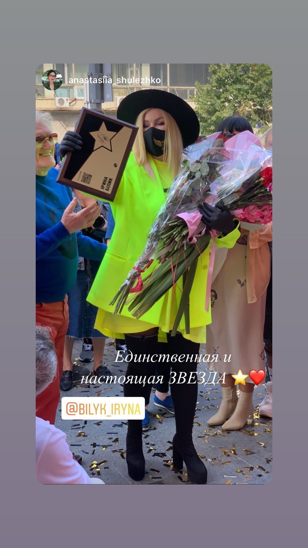 Сьогодні все також відбувалося за протиепідемічними правилами. Співачка була у масці із золотою вишивкою та рукавичках. Привітати Ірину Білик прийшли її зіркові друзі – Юрій Рибчинський, Дмитро Коляденко, Асія Ахат, Аліна Гросу та шанувальники артистки.