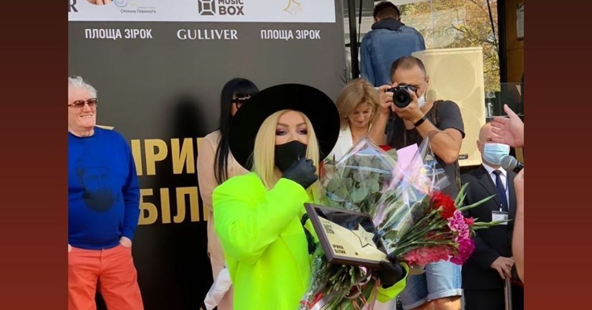 Ірина Білик у масці та в костюмі кольору зелений неон отримала зірку в центрі Києва
