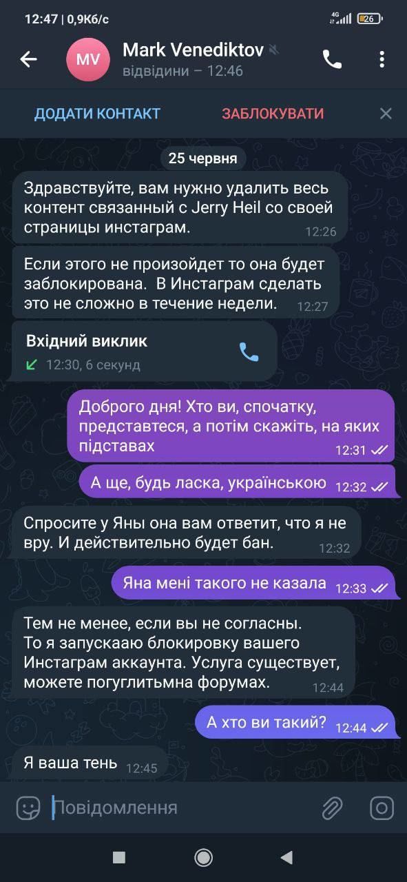 У своєму Telegram артистка розповіла, що житель країни-агресорки надокучає їй в соціальних мережах. Та не лише Jerry Heil неадекватний росіянин не дає спокою, а й її викладачам. Чоловік пише їм повідомлення з погрозами та вимагає видалити весь контент, що пов'язаний із виконавицею.