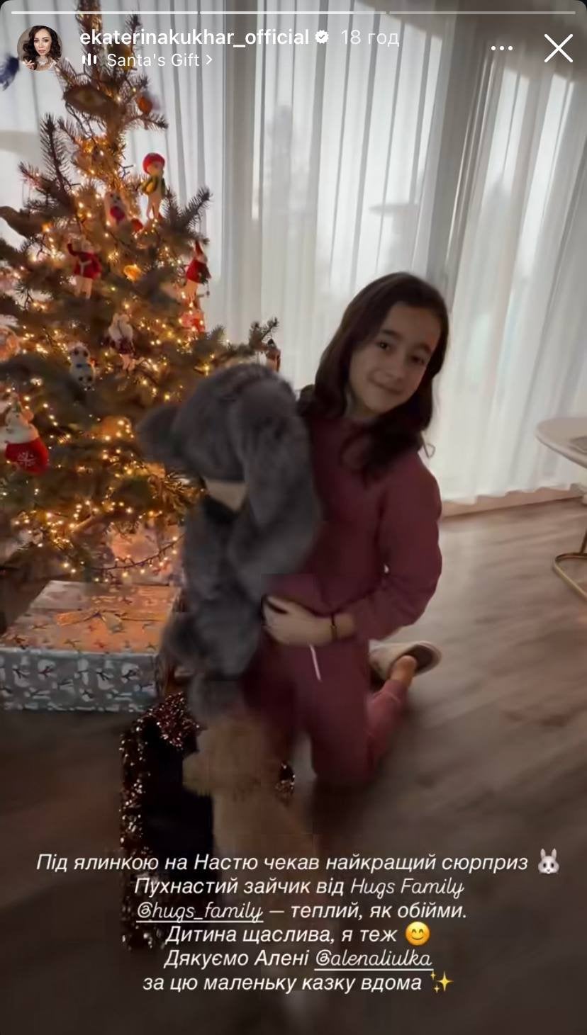 Так, 2026 рік ще не настав, але Настя вже отримує свої перші подарунки. Під ялинкою на доньку Катерини Кухар чекав особливий сюрприз. Дівчинка отримала в подарунок м'яку іграшку, а саме пухнастого зайчика. Як говорить Катерина Кухар, такий презент "теплий, як обійми".