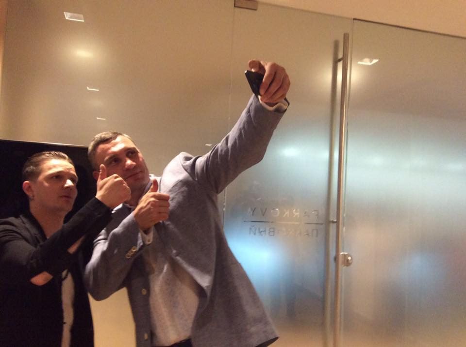 Крім того, Кличко побажав успіху учаснику від України. А Євген Галич показав йому фотографію новонародженого сина. Також очільник столиці сфотографувався із трійкою ведучих цьогорічного конкурсу.