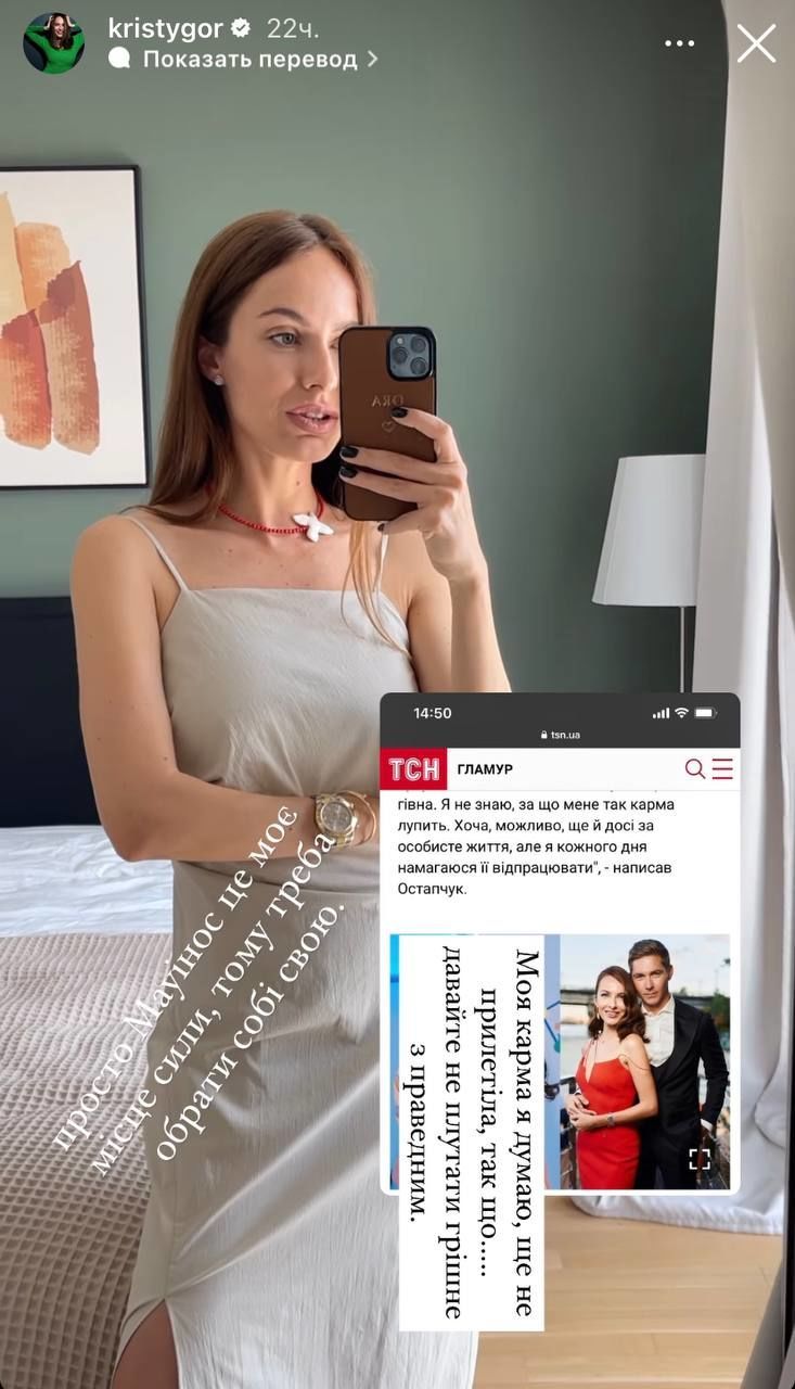 В Instagram-stories блогерка іронічно написала, що від неї "карма поки що не прилетіла". Однак, це станеться, якщо Остапчук не поділить з нею їхній спільний будинок та нахабно забере собі.