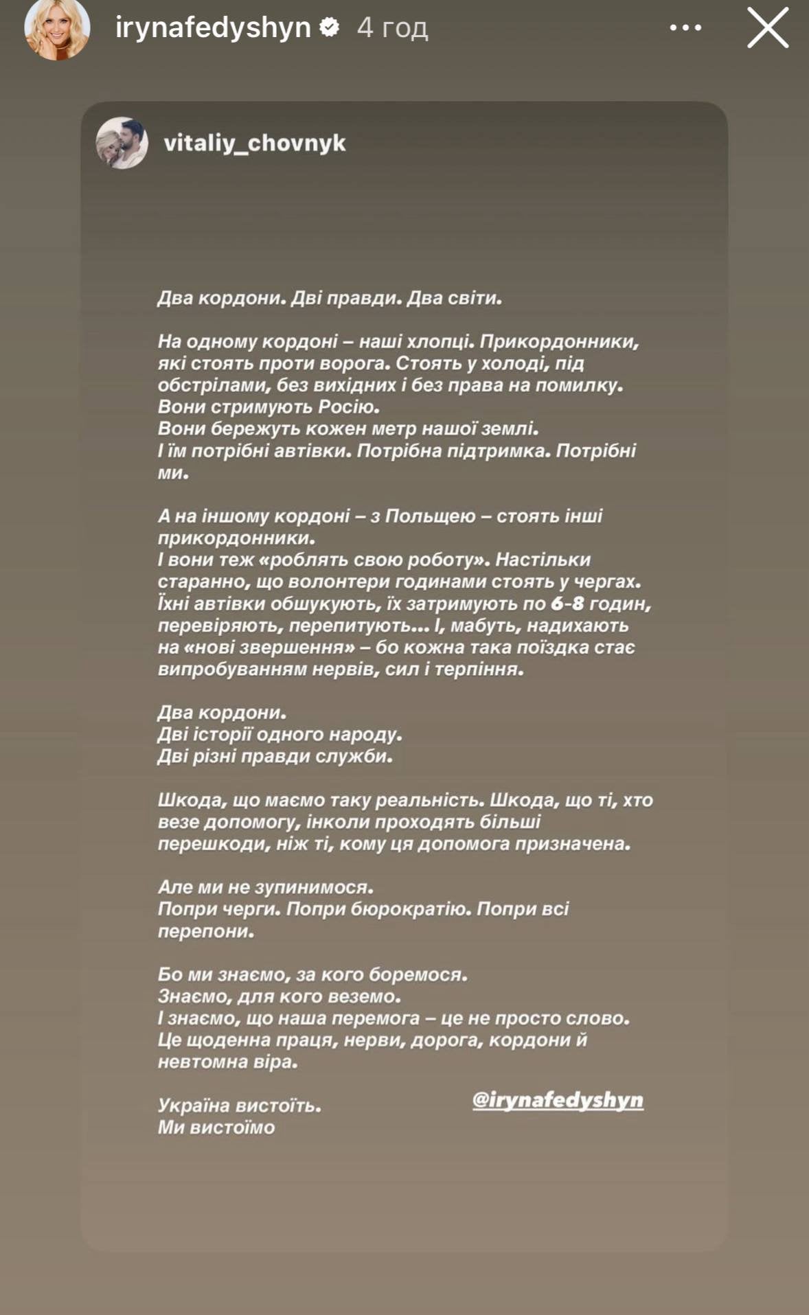 Сториз Ірини Федишин / © instagram.com/irynafedyshyn