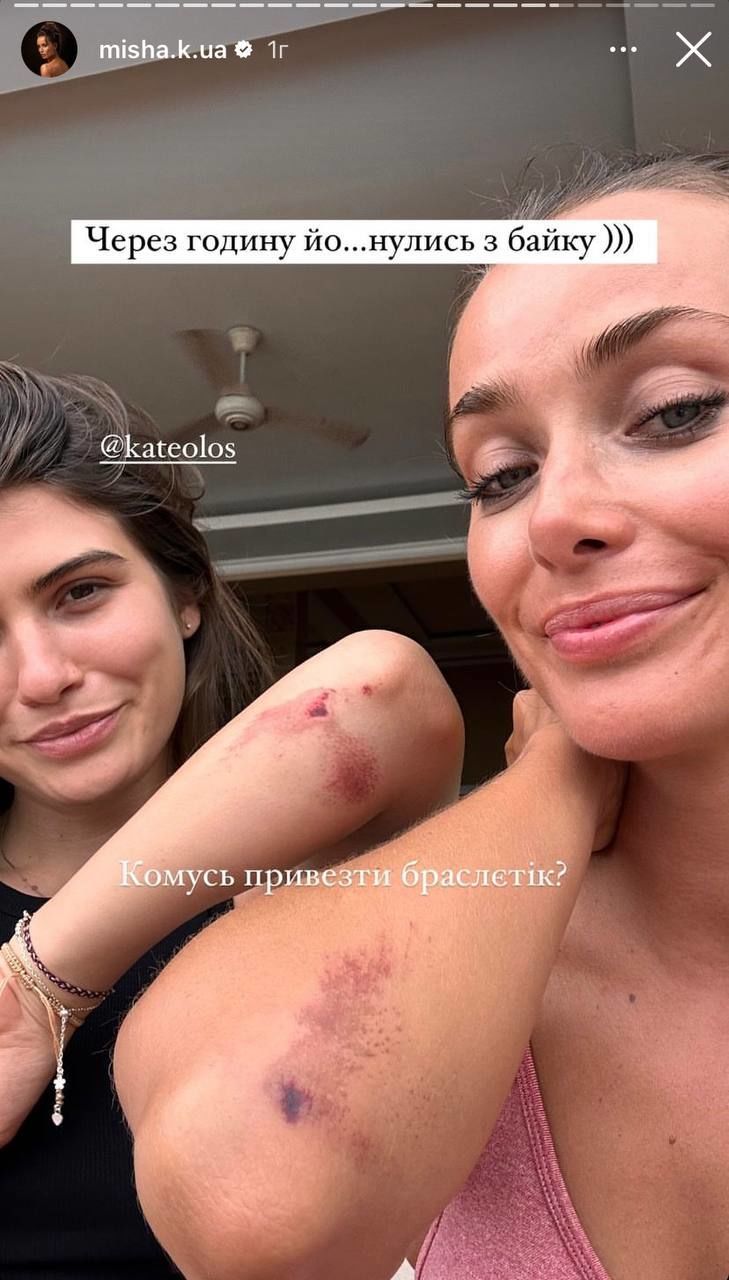 Про це знаменитість розповіла у своєму Instagram. Артистка поділилася, що вони разом із приятелькою впали зі скутера. Без травм не обійшлося. У Ксенії збиті лікті, а її подруги – рани і на руках, і на ногах.