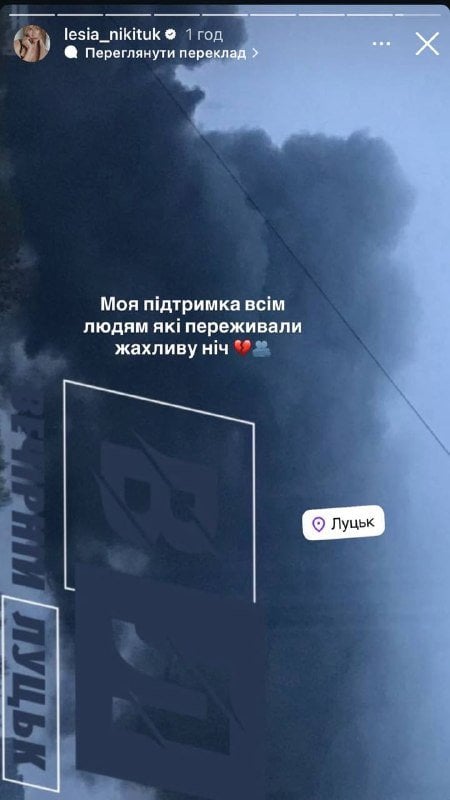 Зірка в Instagram розповіла, що під час ударів у її рідному місті перебували батьки. За словами Лесі, вона не знаходила собі місця і всю ніч переживала за близьких. Вранці телеведуча опублікувала фото наслідків атаки, зокрема з Хмельниччини та Луцька, і висловила підтримку постраждалим.