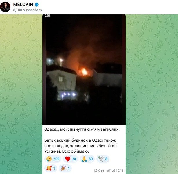 «Одеса… Мої співчуття сімʼям загиблих. Батьківський будинок в Одесі також постраждав, залишившись без вікон. Усі живі. Всіх обіймаю», — написав зірка.