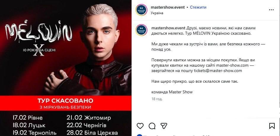 Тур співака MELOVIN українськими містами офіційно скасовано.