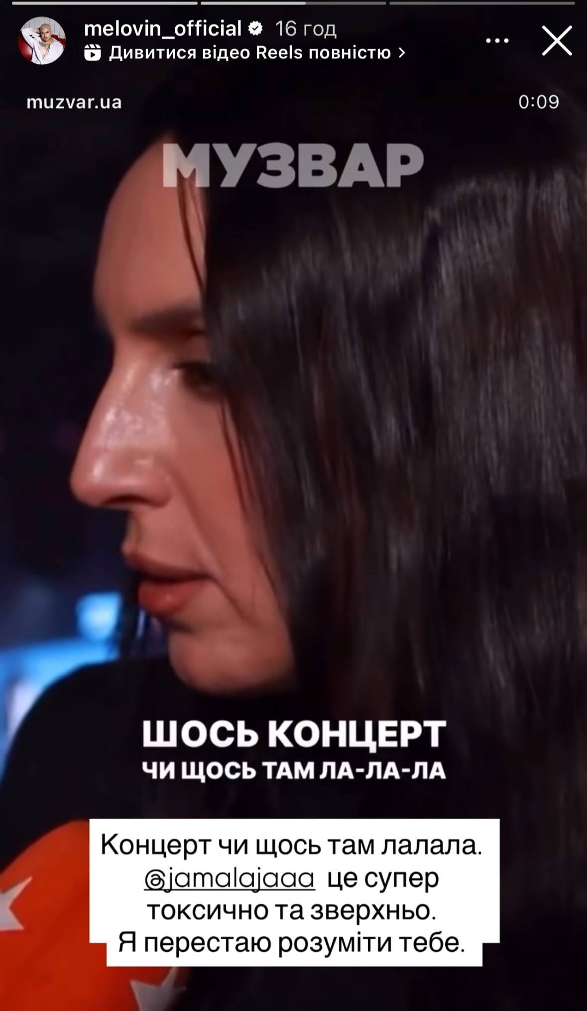 Саме цей фрагмент MELOVIN опублікував у своєму фотоблогу, після чого публічно висловив свою позицію і заявив про своє обурення від тону, у якому продюсерка конкурсу прокоментувала ситуацію. У сториз в Instagram співак не приховував роздратування та різко відреагував на формулювання Джамали.