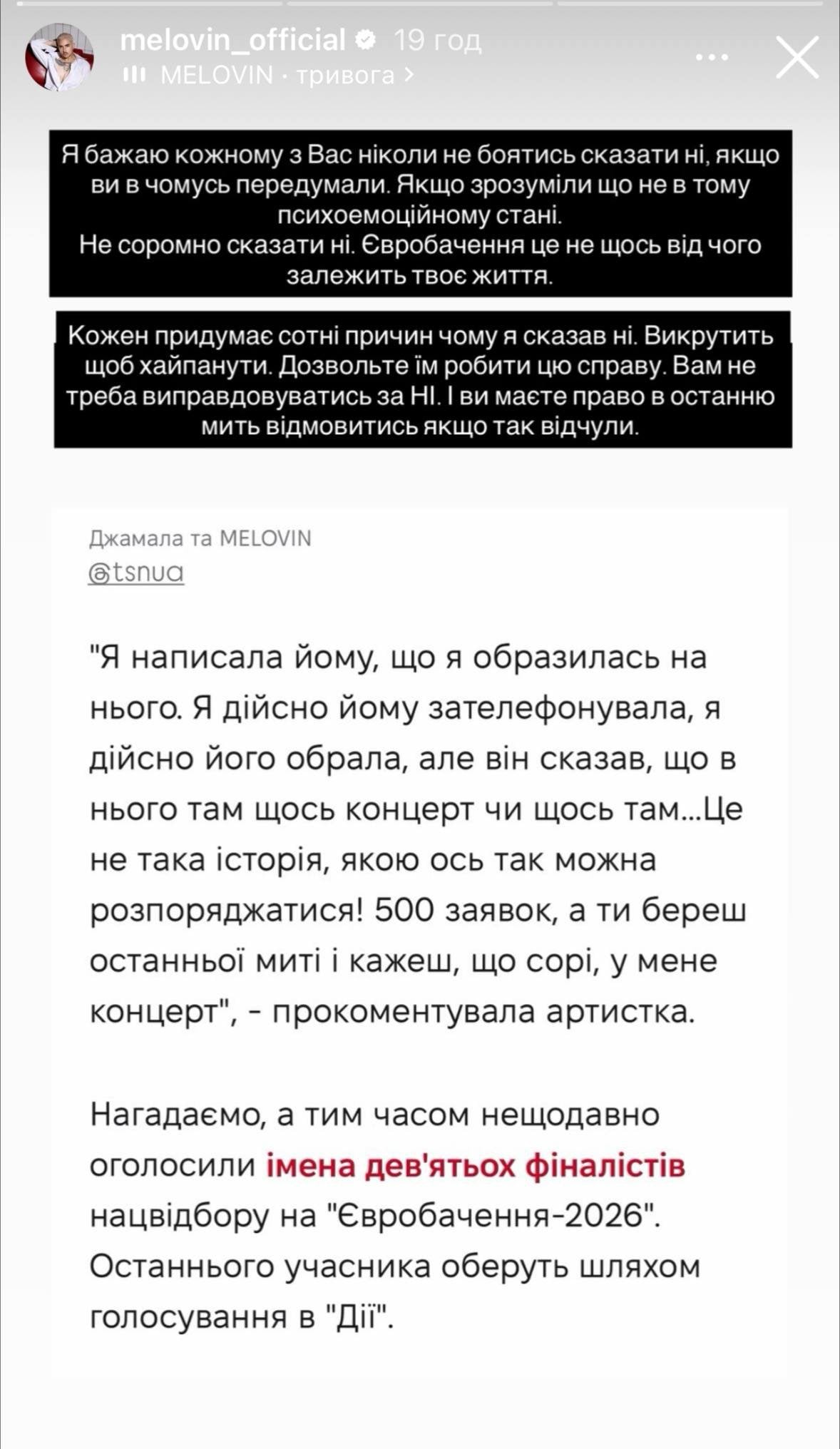 Окрім цього, MELOVIN вирішив ще більше пояснити своє рішення та звернувся до підписників із особистим меседжем. Співак наголосив, що відмова — це не прояв слабкості, а усвідомлений вибір, особливо коли йдеться про психоемоційний стан.