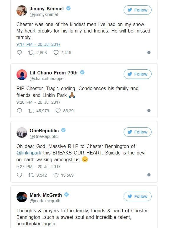 Saddened to learn about the passing of the talented Chester Bennington from Linkin Park. My heart breaks for his family and children.