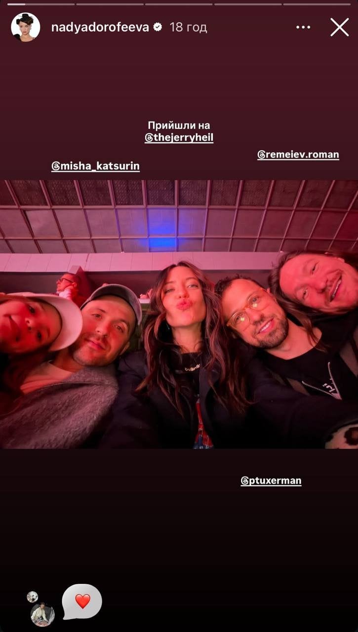 Компанію артистці склали чоловік Міша Кацурін, його донька Саша й друг родини, режисер Антон Птушкін. Всі разом вони прийшли насолоджуватися музичними хітами й обіцяними сюрпризами від Jerry Heil. Спільне миле фото Надя опублікувала в Instagram.