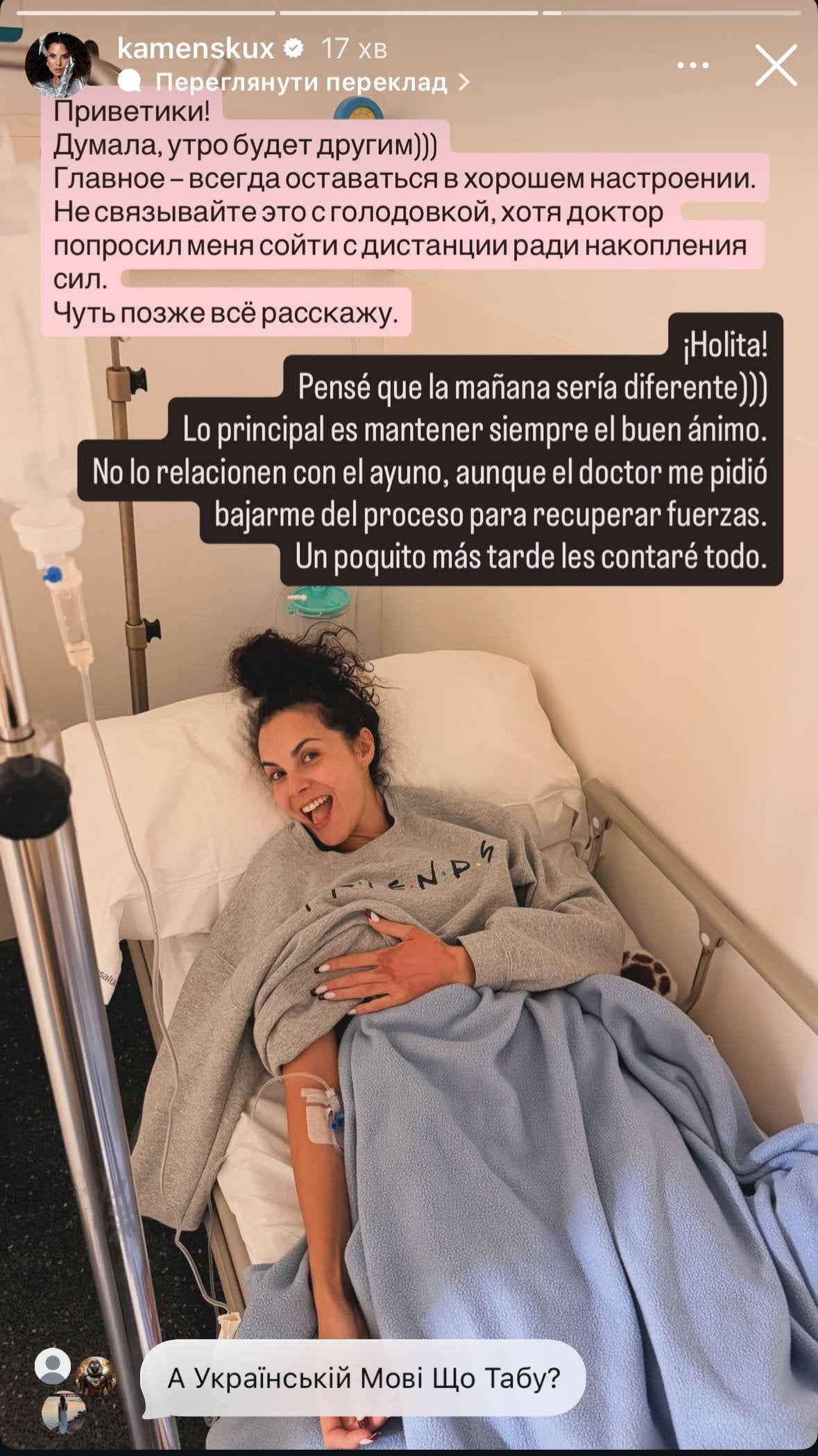 Навіть попри крапельниці та потребу у призупиненні процесу очищення Настя заявила, що не втрачає оптимізму. І написала про це російською та іспанською мовами, за що отримала чергову порцію критики з боку українців за її неоднозначну позицію під час війни в Україні, розв’язаною РФ.