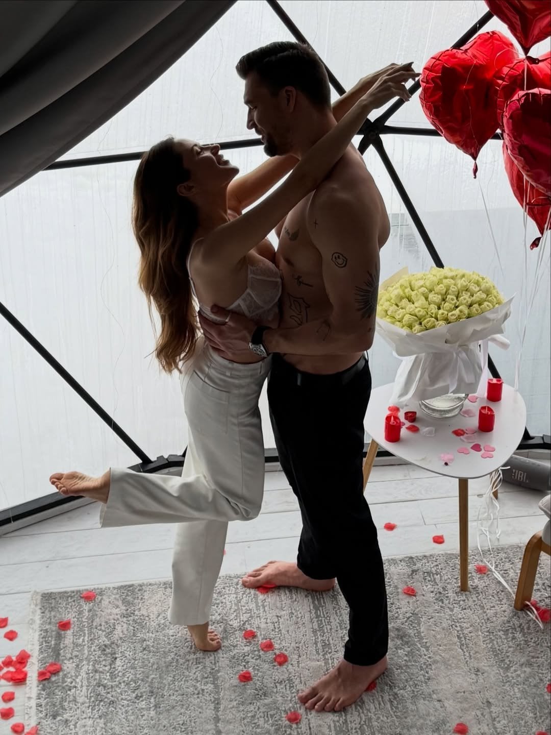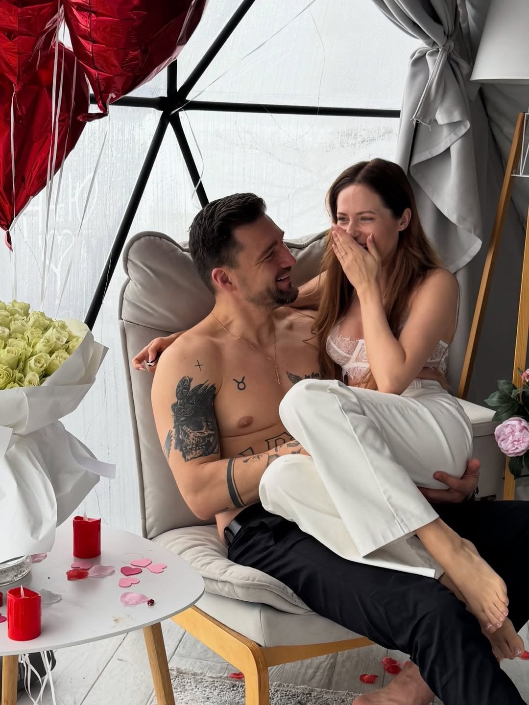 Зокрема, увагу прихильників привернув нещодавній фотосет зірки зі своїм коханим Юрієм Савранським. Парочка удвох попозувала на романтичному відпочинку у купольному глемпінгу. Для особливих кадрів Наталка обрала вишукану білизну й замилувала обіймами з бойфрендом на тлі квітів, кульок і пелюстків троянд.