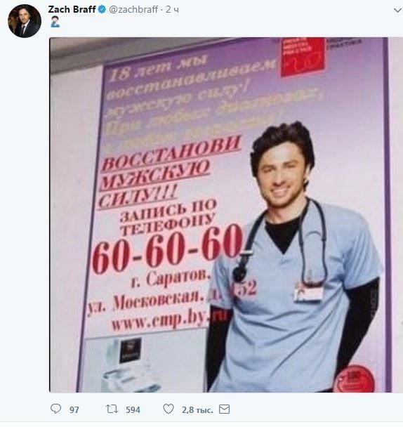 Зак Брафф "рекламує" послуги з посилення потенції / © twitter.com/zachbraff