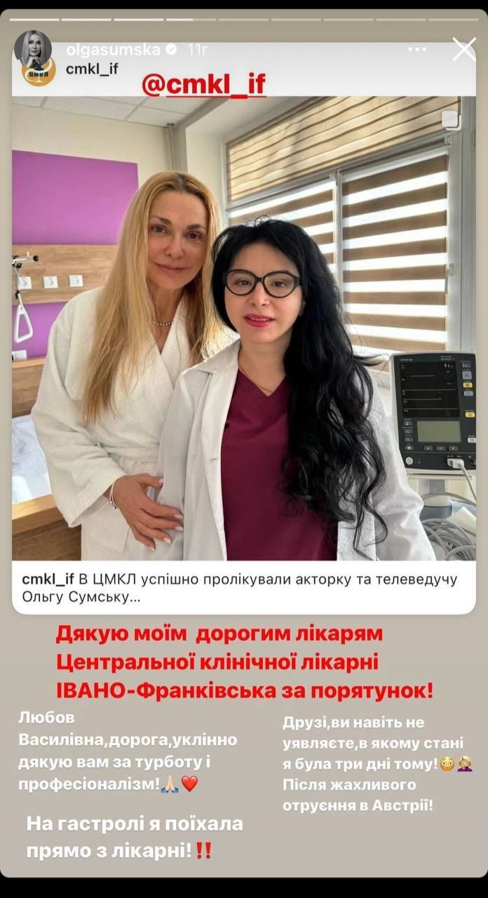 "Доїхали до лікарні в Івано-Франківську. Медсестри вже стояли напоготові, аби взяти аналізи. Коли підійшла лікарка, пані Любов Василівна, я побачила її очі і якось в душі заспокоїлась. Аналізи були жахливі...Якби я ще на пару днів залишилась в Австрії, не знаю, що було б…Почали капати магнезію, решту ліків, антибіотик одразу протягом декількох годин...Я нарешті заснула! Після трьох днів без сну і без їжі…Я вам вдячна за порятунок", - висловилася акторка.