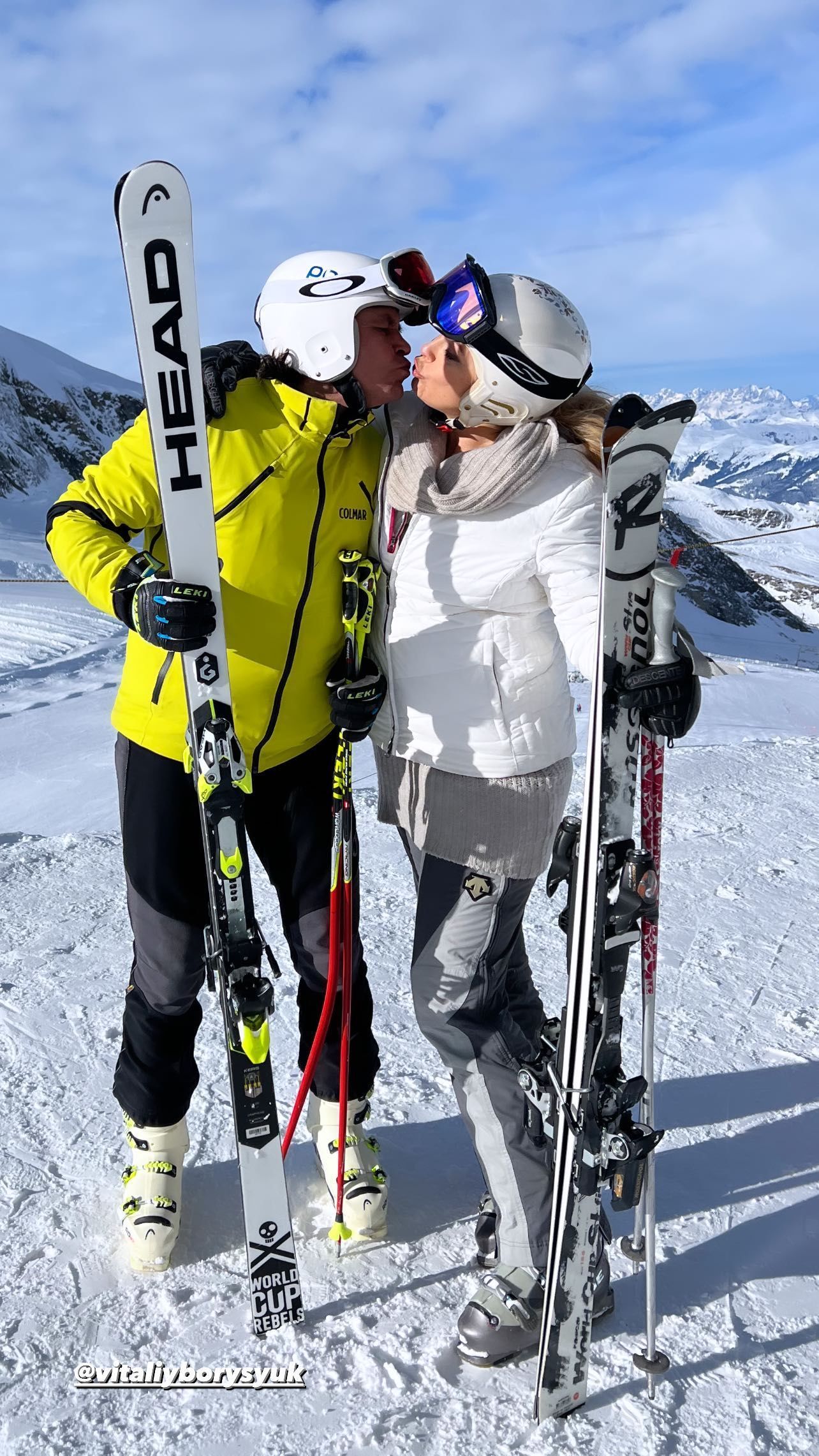 Також 57-річна артистка показалася поруч зі своїм чоловіком. У гірськолижних костюмах усміхнені вони постали на тлі засніжених гір. А потім з лижами у руках подружжя сфотографувалося у момент поцілунку.