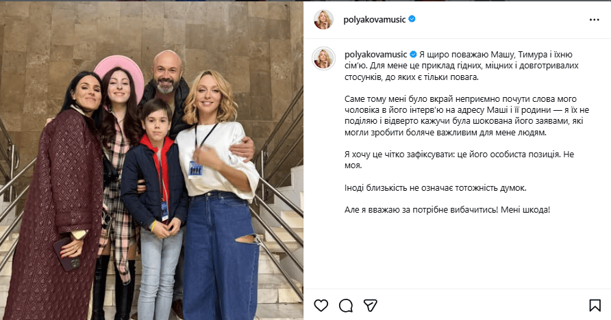 "Я хочу це чітко зафіксувати: це його особиста позиція. Не моя. Іноді близькість не означає тотожність думок. Але я вважаю за потрібне вибачитись! Мені шкода!" – підсумувала артистка.