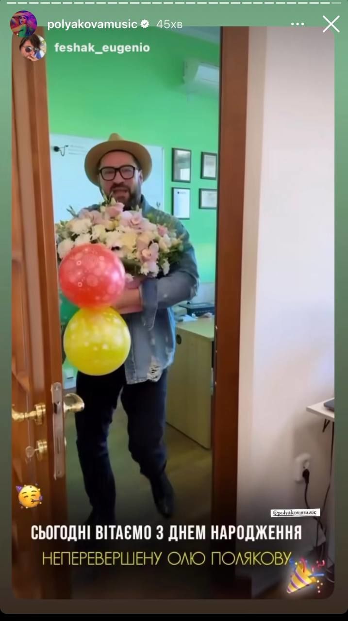 А от ведучий Євген Фешак вручив артистці кошик квітів та чимало повітряних кульок.
