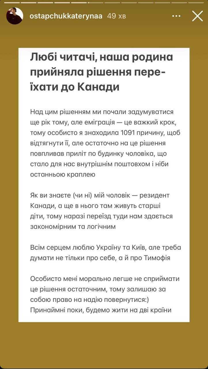 «Любі читачі, наша родина прийняла рішення переїхати до Канади, про що ми почали задумуватися ще рік тому, але еміграція — це важкий крок, тому особисто я знаходила 1091 причину, щоб відтягнути її, але остаточно на це рішення повпливав приліт по будинку чоловіка, що стало для нас внутрішнім поштовхом і ніби останньою краплею», — пояснила Катерина.