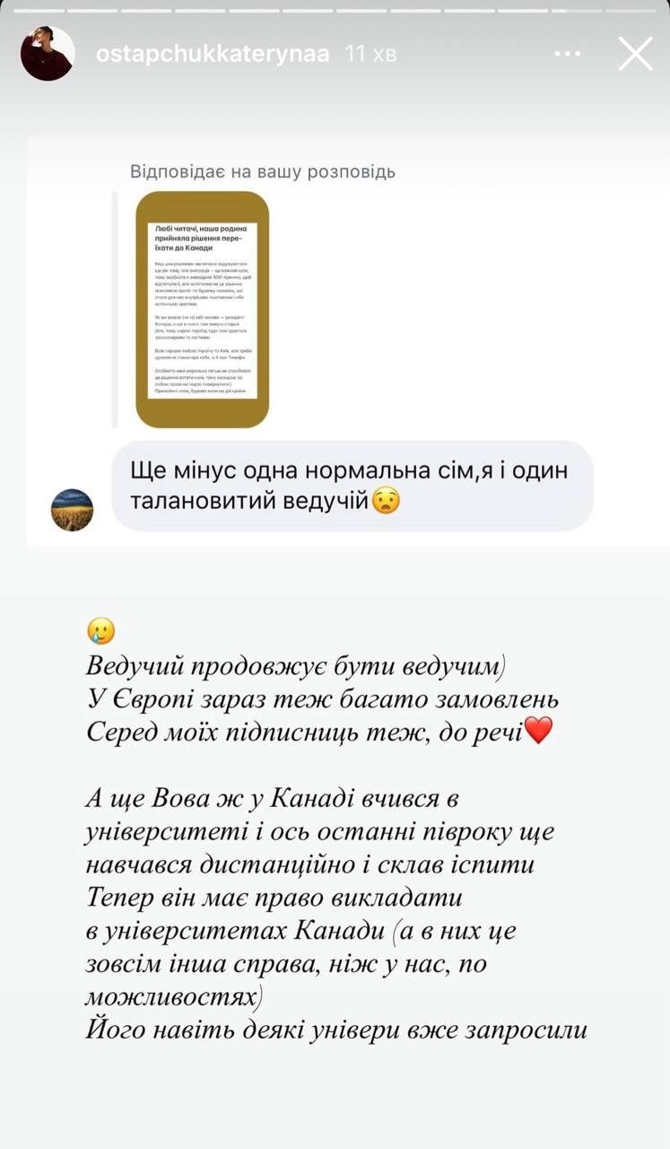 Крім того, Катерина одразу відповіла на запитання юзерів про кар’єру Володимира Остапчука. Блогерка пояснила, що він продовжуватиме брати замовлення на приватні заходи як ведучий, але вже за кордоном. Ба більше, заінтригувала його перспективами у викладацькій діяльності.