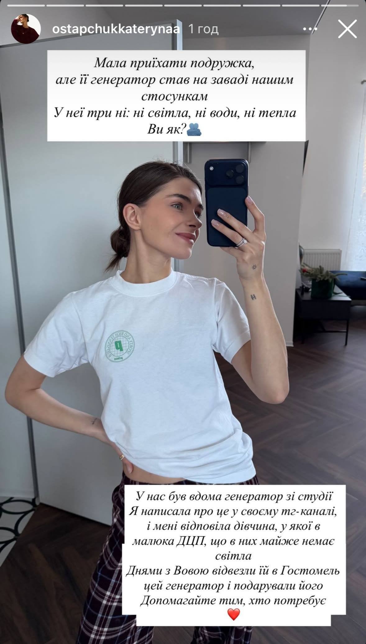 «У нас був вдома генератор зі студії. Написала про це у своєму Telegram-каналі, і мені відповіла дівчина, у якої в малюка ДЦП, що в них майже немає світла. Днями з Вовою відвезли їй в Гостомель цей генератор і подарували його. Допомагайте тим, хто потребує», — закликала Катерина.