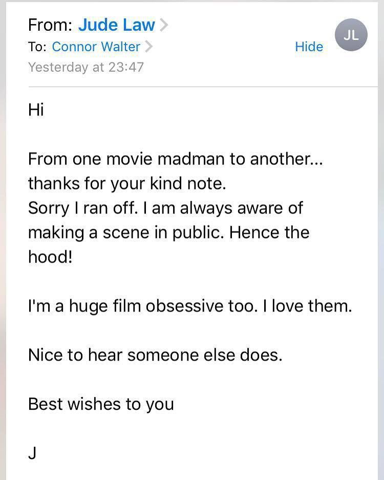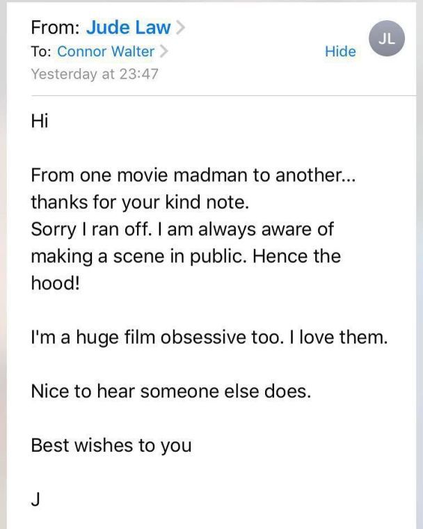 "Привіт від одного божевільного кіномана іншому ... Дякую за твою милу записку. Вибач, що я втік. Я завжди чуйно ставлюся до уваги на публіці. Тому і капюшон! Я теж дуже одержимий кіно. Я люблю його. Радий чути, що хтось ще відчуває те ж саме. Всього найкращого, Джуд", - написав Волтеру актор.