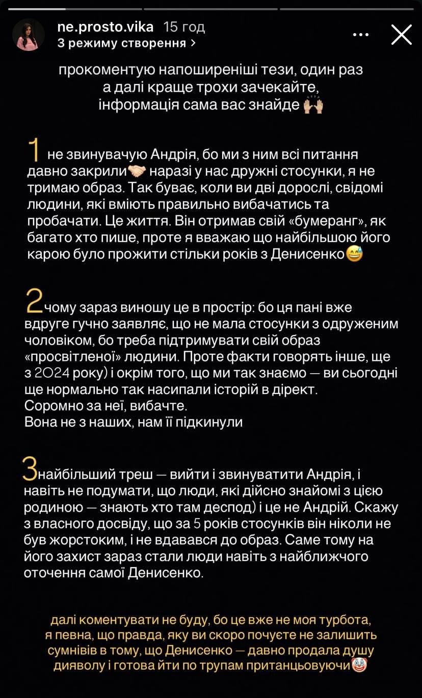 "Найбільший треш - вийти і звинуватити Андрія, і навіть не подумати, що люди, які дійсно знайомі з цією родиною, знають, хто там деспот, і це не Андрій. Скажу з власного досвіду, що за п'ять років стосунків він ніколи не був жорстоким і не вдавався до образ. Саме тому на його захист зараз стали люди навіть з найближчого оточення самої Денисенко", - підсумувала Вікторія.
