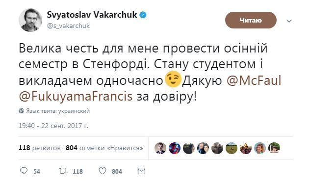 Вакарчук їде вчитися і викладати до Стенфордського університету / © twitter.com/s_vakarchuk