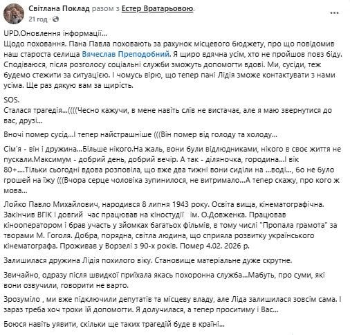 «Сталася трагедія. Вночі помер сусід. Він помер від голоду та холоду. Сімʼя — він і дружина. Більше нікого. На жаль, вони були відлюдниками, нікого в своє життя не пускали. Максимум — "добрий день", "добрий вечір". А так діляночка, городина… І вік 80+. Вдова розповіла, що вже два тижні вони сиділи на воді, бо не було грошей на їжу. Серце чоловіка зупинилося, не витримало. Залишилася дружина Лідія похилого віку. Становище матеріальне дуже скрутне», — приголомшила вдова Поклада.