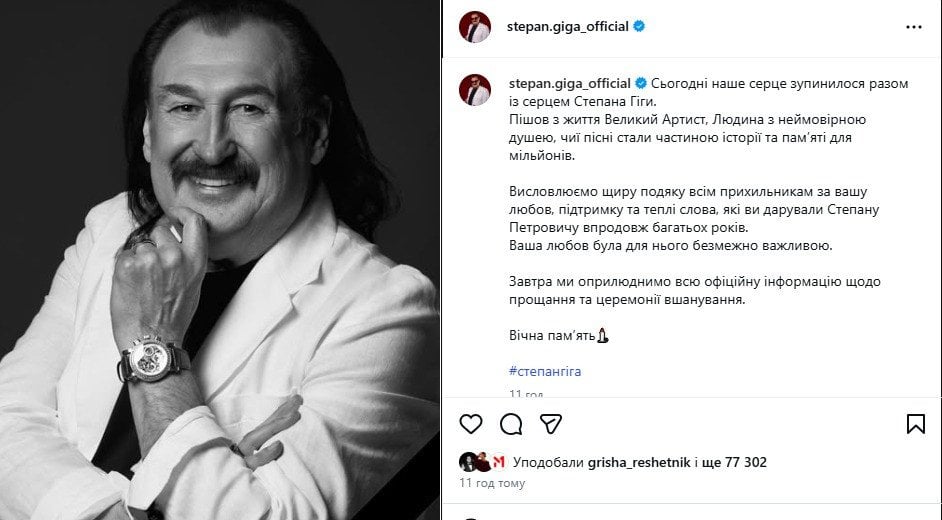 «Сьогодні (12 грудня — прим. ред.) наше серце зупинилося разом із серцем Степана Гіги. Пішов з життя Великий Артист, Людина з неймовірною душею, чиї пісні стали частиною історії та пам’яті для мільйонів», — йдеться у заяві на офіційній сторінці Степана Гіги в Instagram.
