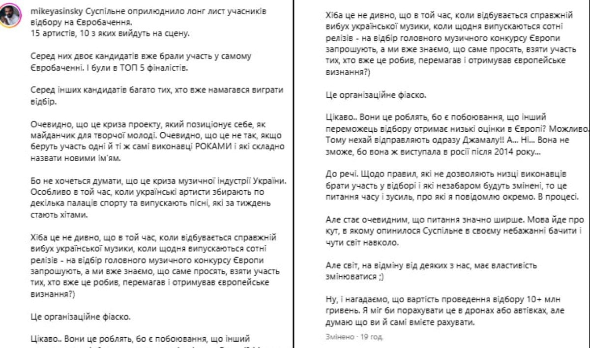 Михайло Ясинський у своєму Instagram говорить, що його обурив список претендентів на участь у "Євробаченні". Мовляв, серед кандидатів одні й ті ж імена. Тим часом, на його думку, на міжнародний конкурс мають їхати нові обличчя.