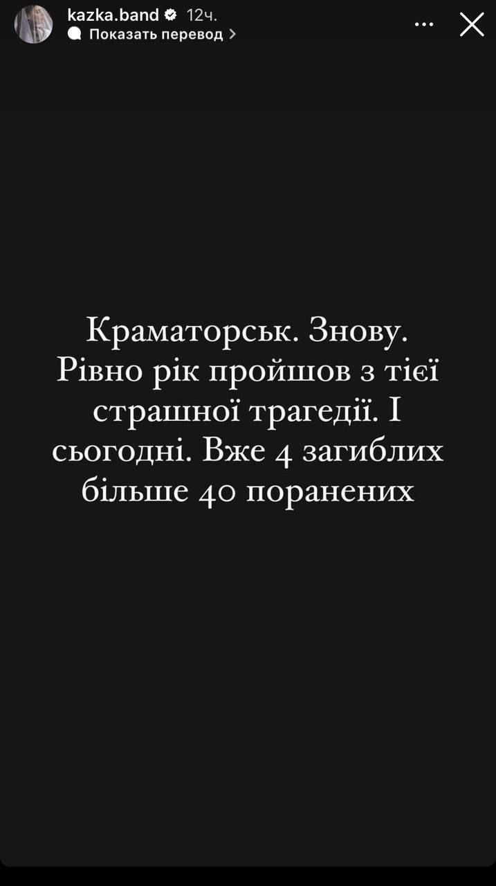 "Черговий злочин Росії проти мирного населення України. Вчора ввечері ворог вдарив по місцевому кафе в Краматорську, де було велике скупчення людей. Серед загиблих є діти. Рятувальні роботи тривають. Вічна пам'ять всім загиблим. Станом на ранок 28.06 - 9 загиблих, 60 поранених" – написала співачка.
