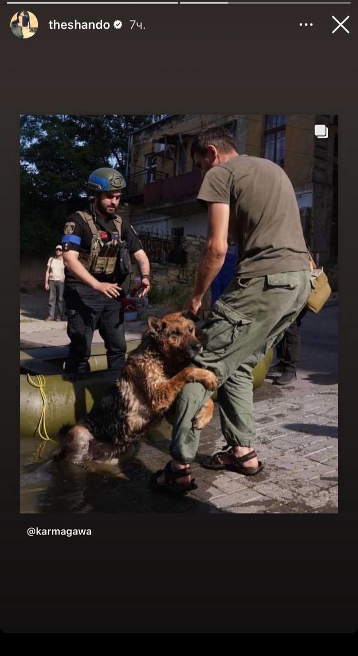 В Instagram-stories голлівудська зірка відреагувала на підрив окупантами Каховської ГЕС. Знаменитість поділилася світлиною, на якій зображений пес, що лапами тримається за ногу рятівника. Чотирилапого дістали з води та врятували його від смерті.