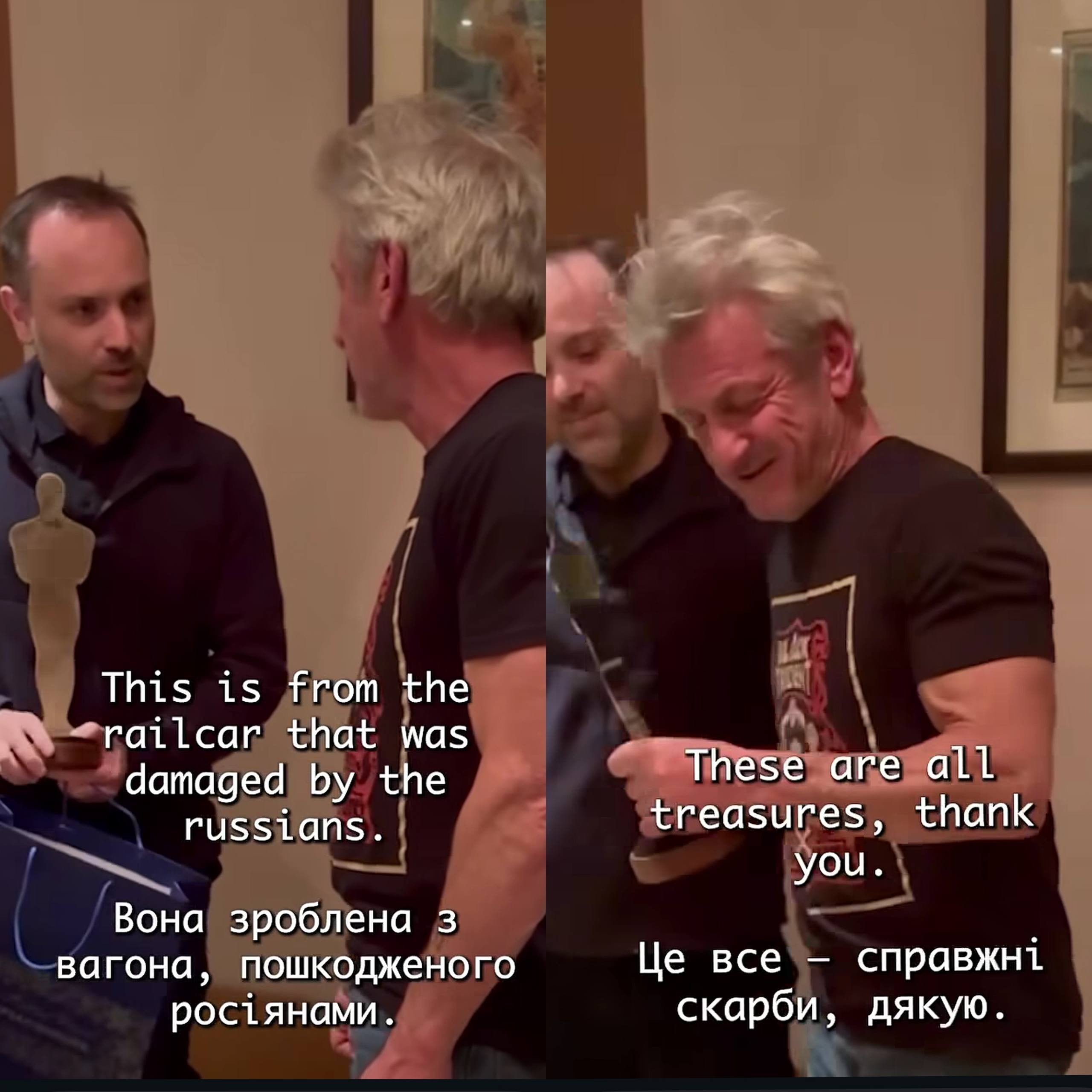 «Шон Пенн не залишився без „Оскара“ та отримав його від „Укрзалізниці!“ Дякуємо за підтримку України, за те, що ви поруч і обираєте бути тут разом із нами. Цей „Оскар“ виготовлений зі сталі вагона, пошкодженого внаслідок російської атаки. І ця нагорода не обмежується досягненнями у кіно — вона вшановує стійкість, людяність і відвагу, які тримають усіх нас у русі», — йдеться у заяві.