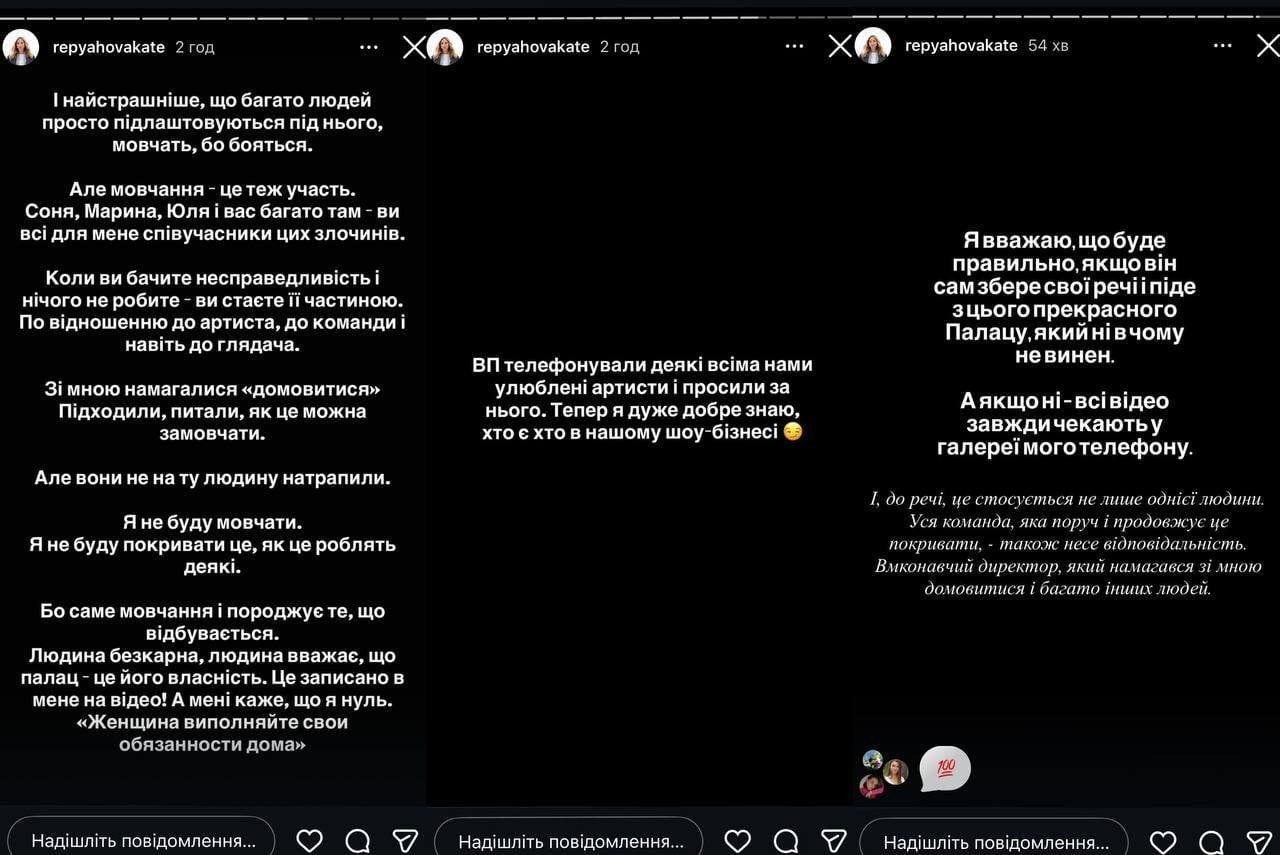«Вони не на ту людину натрапили. Я не буду мовчати. Я не буду покривати це, як це роблять деякі. Бо саме мовчання і породжує те, що відбувається. Людина безкарна, людина вважає, що Палац — це його власність. Це записано у мене на відео! А мені каже, що я нуль: „Женщина выполняйте свои обязанности дома“. Я вважаю, що буде правильно, якщо він сам збере свої речі і піде з цього прекрасного Палацу, який ні в чому не винен. А якщо ні — всі відео завжди чекають у галереї мого телефону. І, до речі, це стосується не лише однієї людини. Уся команда, яка поруч і продовжує це покривати, — також несе відповідальність. Виконавчий директор, який намагався зі мною домовитися і багато інших людей», — підсумувала Катерина.