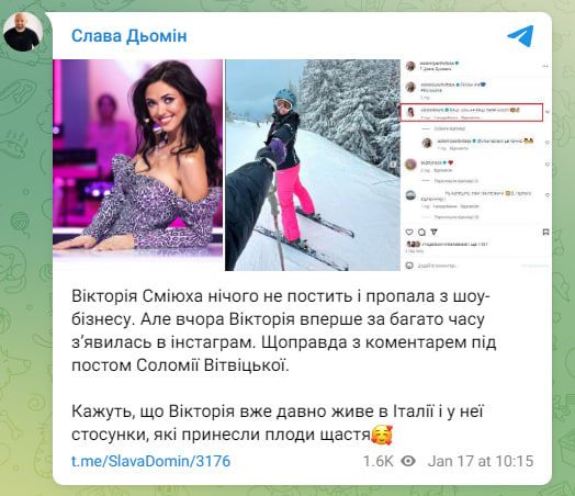 Зокрема, шоумен у своєму Telegram зазначив, що артистка нібито вже тривалий час живе в Італії. Ба більше, виконавиця там перебуває не сама. За словами Дьоміна, Вікторія знайшла своє щастя. Співачка нібито більше не самотня, а перебуває у щасливих стосунках, які "принесли свої плоди".