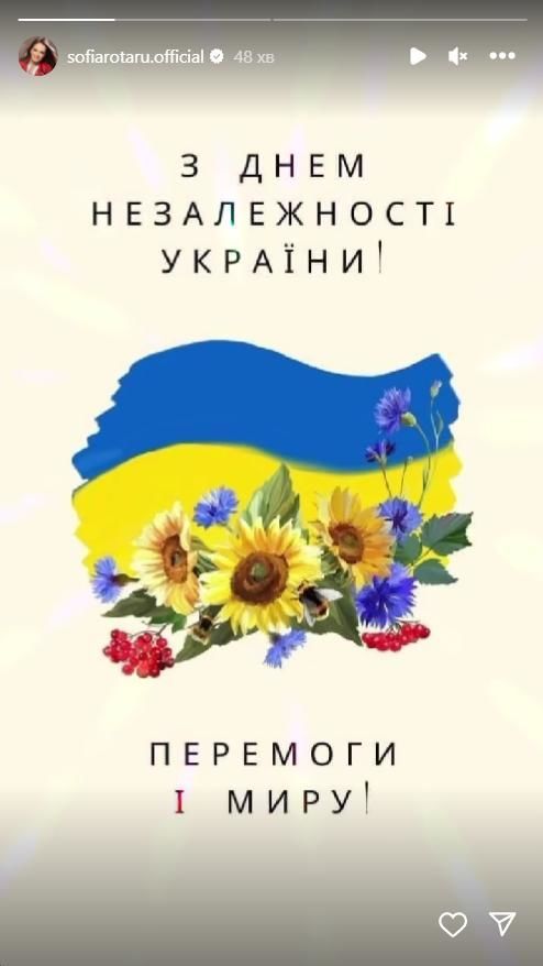 У сторіз своєї сторінки в Instagram виконавиця розмістила барвистий малюнок, на якому зображений український прапор у квітах. Цей знімок Софія Михайлівна підписала українською мовою: