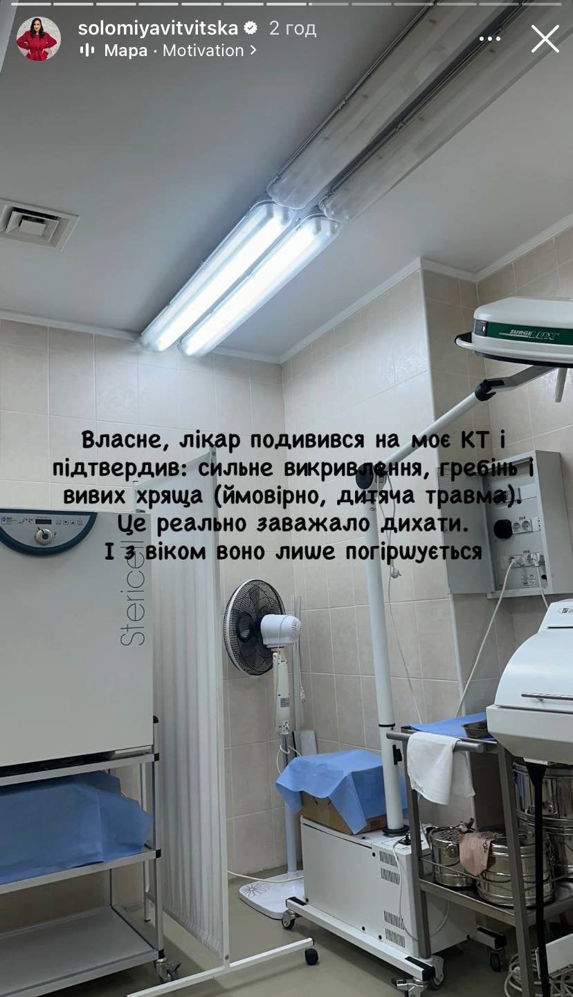"У мене багато років було викривлення носової перегородки. І це про дихання, сон, алергію та постійні риніти…І чим далі, тим більше відчувала, що в кризові моменти важко дихати. А це дефіцит кисню та інші проблеми. Власне, лікар подивився на моє КТ і підтвердив сильне викривлення, гребінь і вивих хряща (ймовірно, дитяча травма). Це реально заважало дихати. І з віком лише погіршується", — зізналась ведуча.