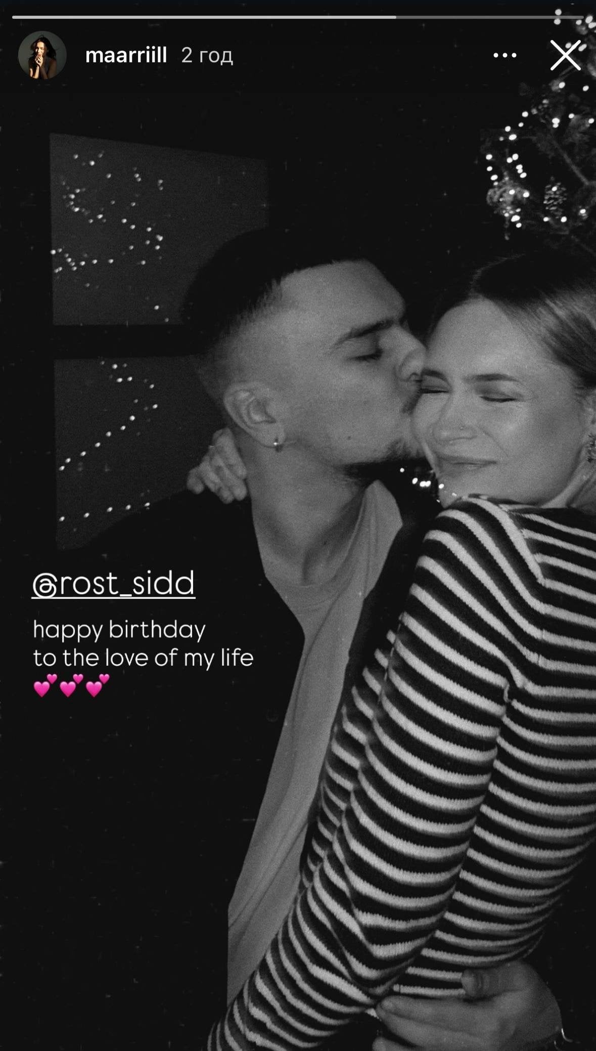 У своїх Instagram-сториз Марія ніжно привітала коханого — танцівника Ростислава Сидоренка — з днем народження. Вона опублікувала їхнє спільне фото, яке було зроблено у новорічну ніч. Закохані позували на тлі яскраво прикрашеної ялинки: Ростислав ніжно пригортав Марію до себе й цілував її в щоку, а вона у відповідь сяяла щасливою усмішкою.