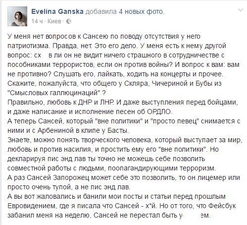 SunSay записав спільну пісню разом із Арбеніною, Скляром, який є прихильником так званого лідера терористів Захарченка, Бобунцем, котрий часто виступає на окупованій території з концертами, і з репером Бастою.