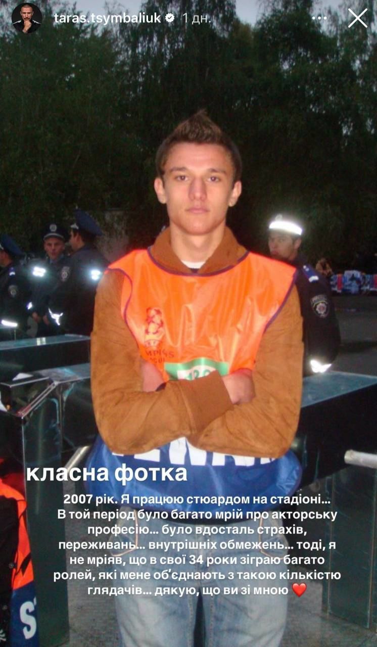 "Класна фотка. 2007 рік. Я працюю стюардом на стадіоні. В той період було багато мрій про акторську професію, було вдосталь страхів, переживань, внутрішніх обмежень. Тоді я не мріяв, що у свої 34 роки зіграю багато ролей, які мене об'єднають з такою кількістю глядачів", - написав Цимбалюк.