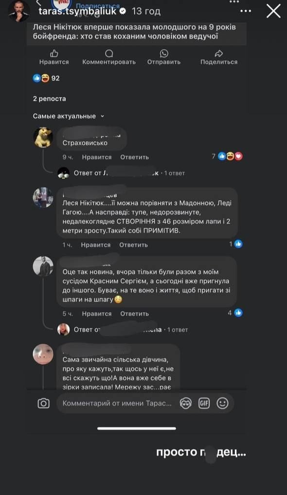Гнівні коментарі про Лесю Нікітюк та її обранця / © instagram.com/taras.tsymbaliuk
