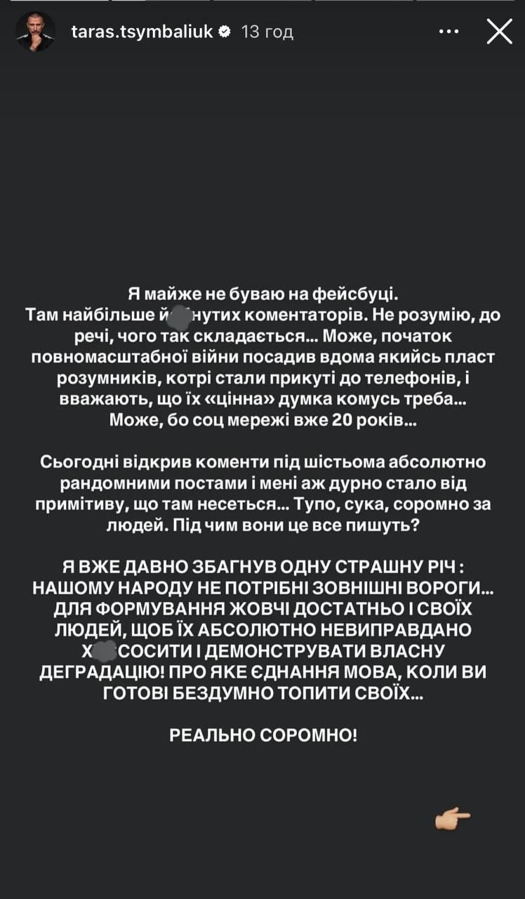 Тарас Цимбалюк говорить, що йому соромно за таких людей, які пишуть необґрунтовану критику в коментарях. Особливо артиста обурює, що "своїх цькують під час війни". На думку актора, нині потрібно як ніколи єднатися проти спільного ворога. Утім, Цимбалюк зауважив, що далеко не всі це розуміють і поливають брудом своїх же.