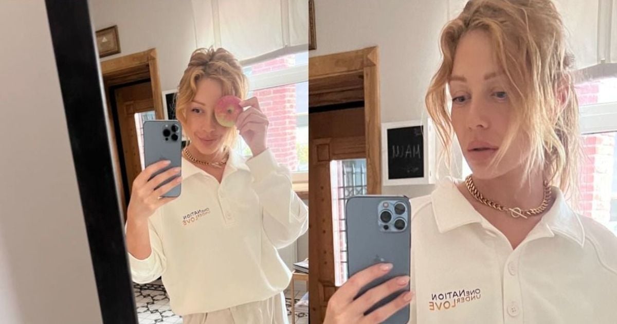 Свій образ у всій красі виконавиця також продемонструвала на фото у дзеркалі в повний зріст. Кароль позувала у тому ж вбранні з яблуком з власного саду. Гарні кадри співачка залишила без підпису.