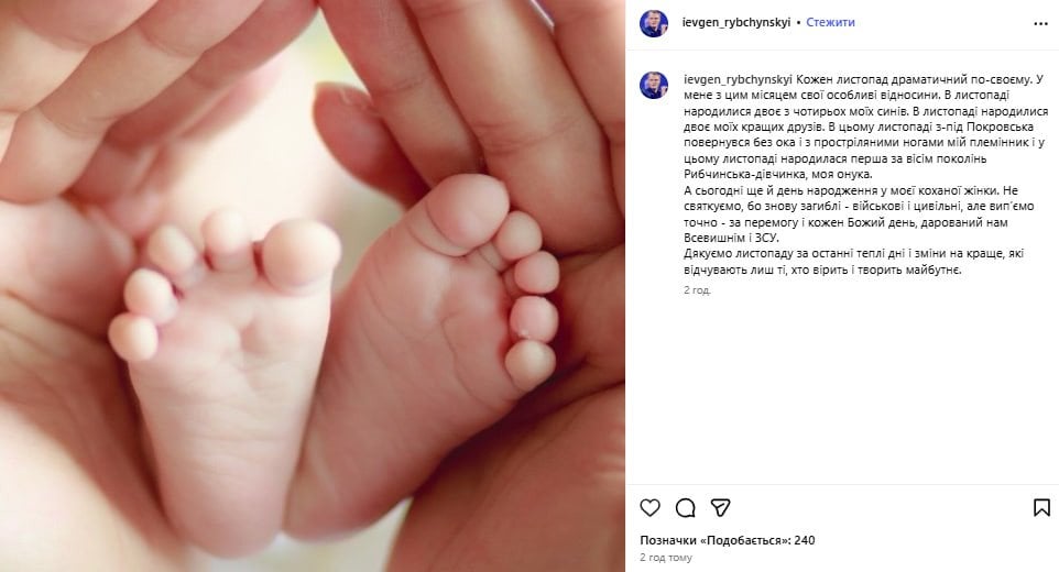 У своєму Instagram знаменитість поділився, що листопад є для нього особливим. Саме цього місяця народилося двоє з чотирьох синів поета. Однак тепер на один день народження у листопаді у родині стало більше. У Євгена Рибчинського народилась онука. За словами поета, це перша дівчинка в їхній родині за вісім поколінь.