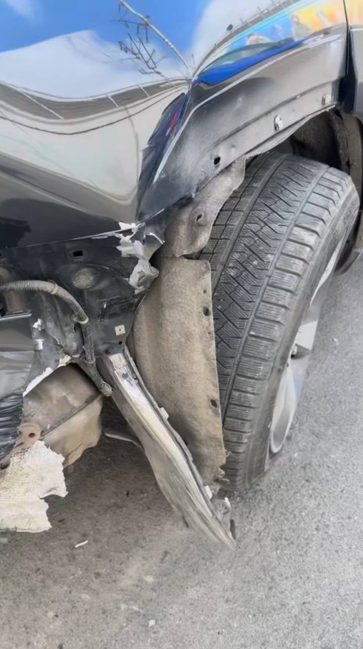 На щастя, ніхто з учасників аварії не постраждав. Однак автомобіль зазнав суттєвих механічних пошкоджень через що його везли на СТО на евакуаторі. На опублікованих кадрах видно зім’яте крило, спущену шину, вибиті стопи та деформований бампер.