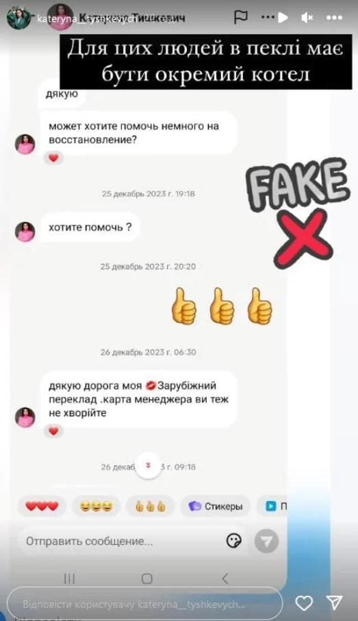 У сторіз своєї сторінки в Instagram артистка розмістила декілька скрінів, зроблених у соцмережах. На них видно, що злочинці від імені Тишкевич просять у людей гроші нібито на її лікування.