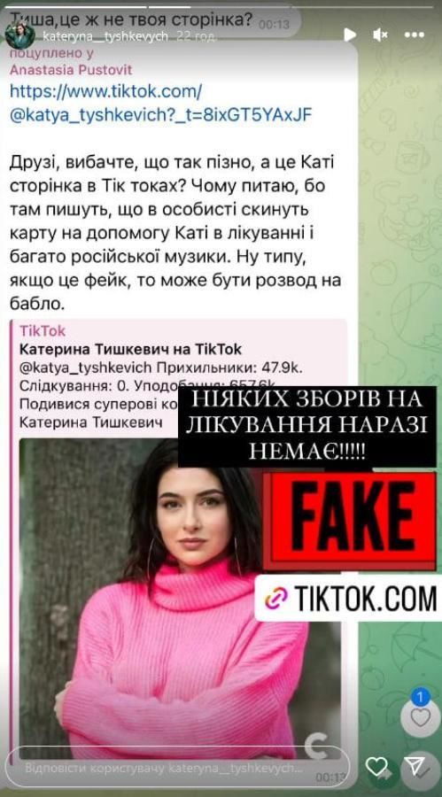 Шахраї створили у TikTok фейковий акаунт Тишкевич, який спілкується нібито від її імені з шанувальниками зірки, яка наразі проходить лікування. Скріни артистці надіслали її знайомі. Недовіру до акаунту викликало те, що там багато російської музики: